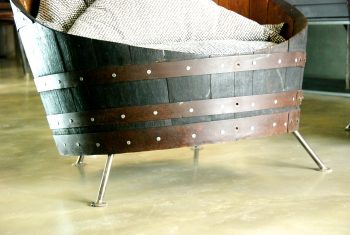 Oak barrel, modern, ultra-sturdy, and 100% comfortable armchair. Two armchairs out of an Armagnac 225 l barrels. Inside and outisde carving for a very exclusive design, painted with indian ink. The barrel hoops were removed and the staves were entirely reinforced. A massive but bare piece of furniture. Showcase it in the summer lounge of an authentic cottage, to complement the edgy decor of a modern villa or of an industrial style loft. Swivel chair with a steel base, provided with anti-skid floor pads, polished finishing touches. Eco-friendly furniture entirely designed and produced in our workshop. Upcycling from Gascony like you’ve never seen before! BY BRUT DESIGN