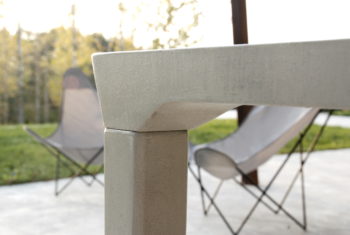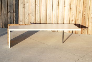 Son plateau en béton ultra haute performance fibré, aux tons graphites, est d’une solidité à toute épreuve. La structure d’appui en une seule pièce est un savant assemblage de chêne massif légèrement grisé et ciré. Entièrement désignée et fabriquée en atelier sur commande, elle est livrée avec des patins feutres ou plastiques selon votre revêtement de sol. Livraison en France métropolitaine uniquement.